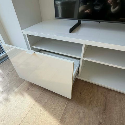 Tv-bord i lyst trælook med rektangulær topplade. Møblet har åbne hylder i midten, velegnet til elektronik eller opbevaring, samt en skydelåge i den ene side til skjult opbevaring. Egnet som tv-møbel eller lavt opbevaringsmøbel i stue eller værelse.