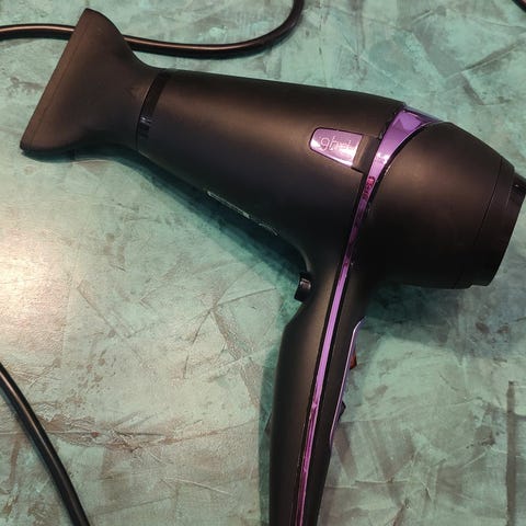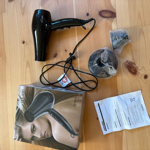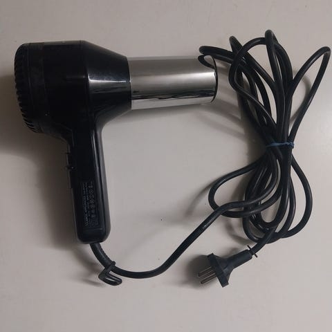 Kompakt hårtørrer i rejsemodel i rosa/metallic farve. Ledning medfølger og er fastmonteret på enheden. Hårtørreren har betjeningsknapper på håndtaget og luftudtag i enden. Velegnet til almindelig hårtørring derhjemme eller på rejser, hvor der ønskes en mindre og let model.