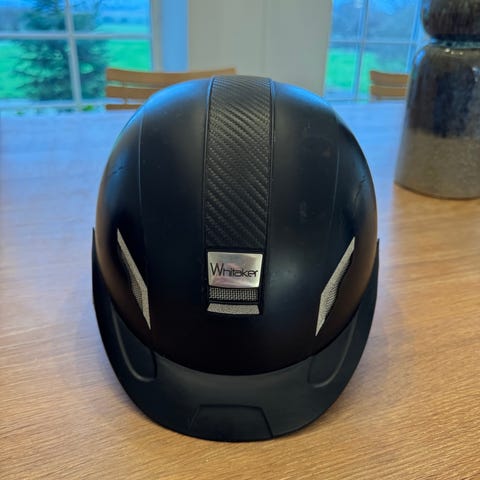 Whitaker VX ridehjelm i størrelse S/M. Hjelmen er sort med detaljer i carbon-look og blanke indsatser foran og bagpå. Indersiden har mesh- og coolmax-stof for ventilation og komfort. Velegnet som ridehjelm til ryttere, der ønsker en justeret pasform i S/M-størrelse.