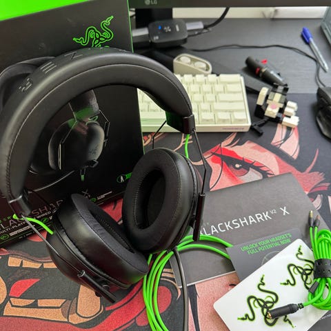 Jeg sælger dette Razer BlackShark V2 gaming headset med kabel i grøn/sort.
