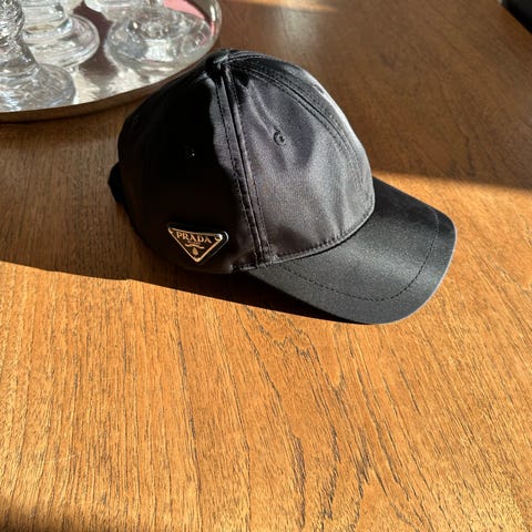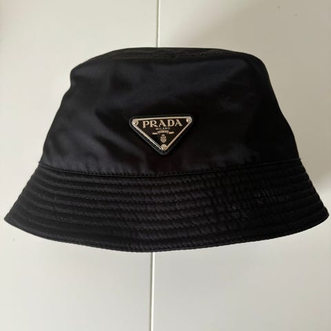 Prada bucket hat til herre / unisex i str. S. Hatten er fremstillet i sort nylon og har det karakteristiske Prada-logo på fronten. Klassisk bøllehat-design med rund puld og nedadgående skygge. Velegnet til hverdagsbrug og som accessory til både casual og mere formelle outfits.