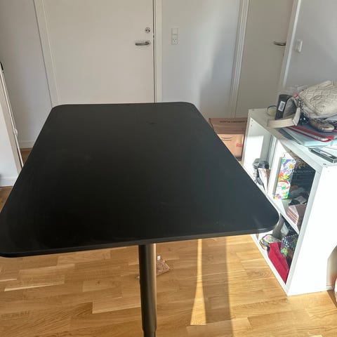 Skrivebord med skuffesektion, forhøjning til fx skærm eller laptop og hylde sektion, samt tre reoler i samme look. Brugt men har stort set kun mærker på metal benene på bordet. Der er to hylder til den med klods kasser i, som ligger i bunden af dem.