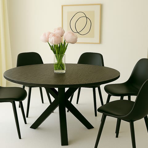 Bordet er rundt men der medfølger to plader som nemt kan sættes til bordet. Bordet fylder cirka Ø110cm når det ikke er sammensat.