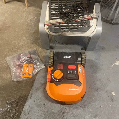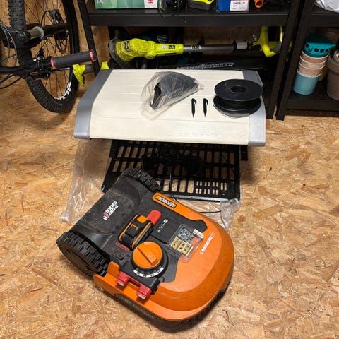 Medfølgende ses ladestation, strømforsyning, kabler, afgrænsningsmateriale og diverse smådele.