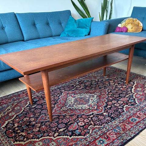 Sofabord i fin stand med praktisk og fin flettet hylde under bordpladen.