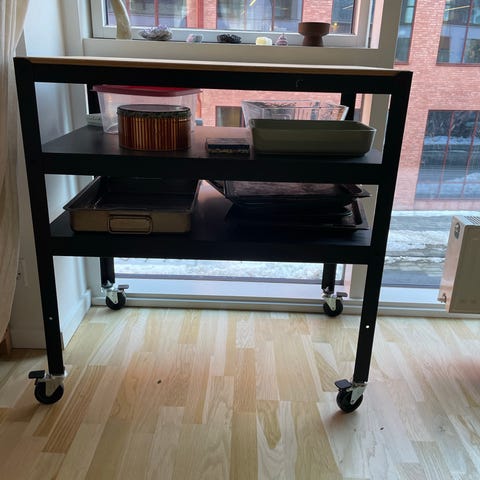 Praktisk og rummeligt rullebord med skuffer og hylder – perfekt som ekstra bordplads i køkkenet, til opbevaring eller som serveringsvogn. Bordet er i et tidløst design.