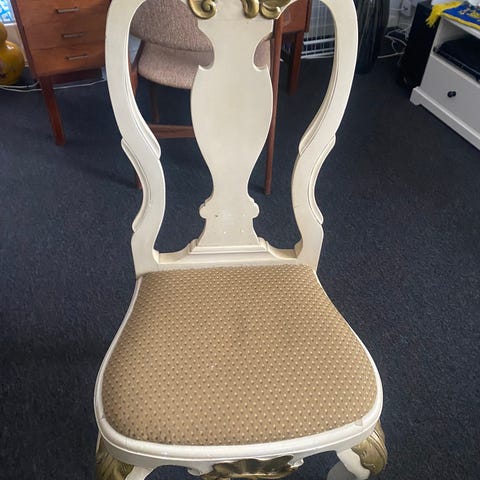 Stole og bord, 2 guld farvede højryggede stole med snoninger på ben og ryg. Stolene er med guld stifter med tilhørende firkantet bord. De er ca fra 1890. Stolens højde: 110cm.
