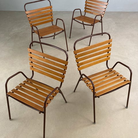 Den varme patina i teaktræet står smukt til det lyse stel og understreger stolenes autentiske vintagekarakter.