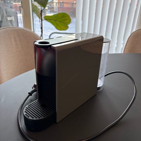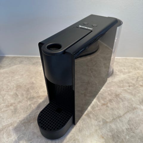 Nespresso mini essenza kaffemaskine i sort. Maskinen er kapselbaseret og har en kompakt, rektangulær form med aftagelig vandtank på bagsiden. På toppen er der to knapper til brygning af kaffe i forskellige kopstørrelser. Drypbakken foran kan bruges som kopstøtte. Velegnet til brygning af espresso og lungo med Nespresso-kapsler i hjemmet eller på kontoret.