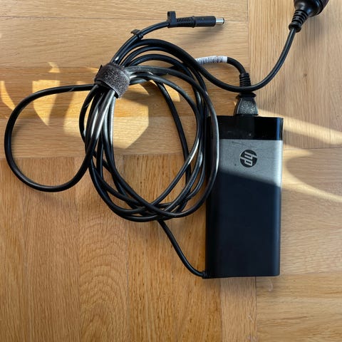 Strømforsyningsadapter til bærbar computer. Standard netadapter med tilhørende strømkabel og rund DC-stikforbindelse.