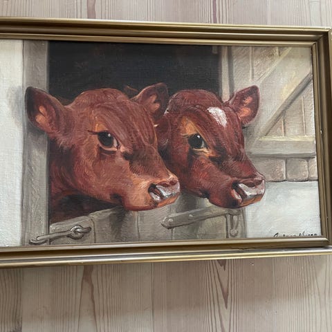 Oliemaleri af Mark Osman Curtis - Kalve ved trug, udført som olie på lærred med motiv af køer i et åbent landskab under skyet himmel. Mark Osman Curtis (1879-1959):