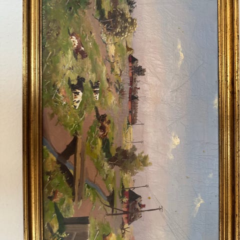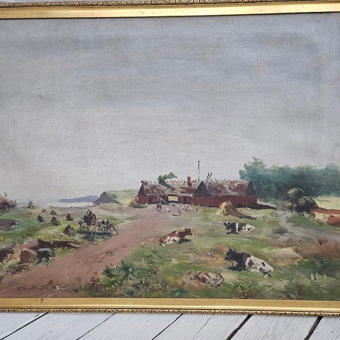 Maleri olie på lærred med køer i landskab i guldramme