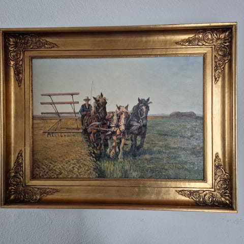 Billedet er monteret i en profileret guldfarvet ramme. Bagsiden viser traditionel opspænding på træramme med snor til ophængning. Signatur ses nederst i billedet. Velegnet som vægdekoration i stue, gang eller sommerhus med klassisk eller landlig indretning.