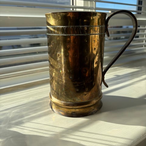 Messing krus, Med blade kraveringer i forskellige design. med hank. bunden er med glas, så man kan se igennem oppe og nedefra. special , meget gammel. mål: bunden dia: 11,3 cm. øverst dia 7,8 cm. højde 12,5 cm. nr i side B.I.C 550.