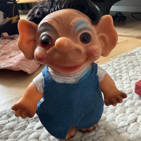Dam Gjøl Trold. Dukken har karakteristisk troldelook med stort hoved, markante øjne og lyst hår. Den er iført ternet kjole. Velegnet som samlerobjekt eller som pynt.