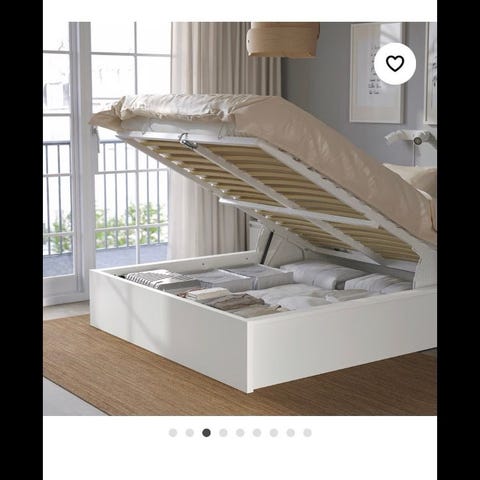 IKEA seng med opbevaring i størrelsen 140x200 cm i hvid. Sengen har løftbar lamelbund, der giver adgang til et stort opbevaringsrum under madrassen, egnet til fx sengetøj, tæpper eller kasser. Rammen har hovedgavl og en lukket sokkel, så opbevaringen er skjult. Velegnet som dobbeltseng i soveværelse eller gæsteværelse, hvor der er behov for ekstra opbevaringsplads.