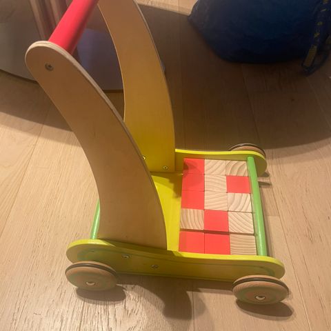 Vognen er i kraftigt træ med stabile hjul og god tyngde, så den ikke vælter let. Den har lille rum til legetøj foran og et solidt håndtag, som barnet kan støtte sig til.