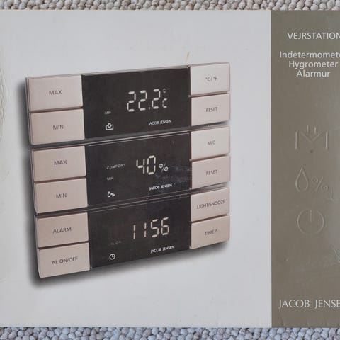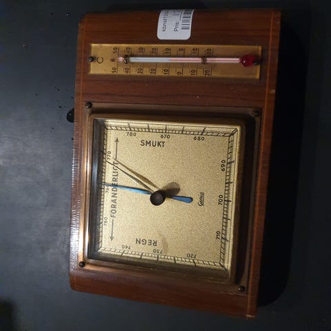 Danbar vejrstation monteret på træplade. Der er termometer, barometer og hygrometer