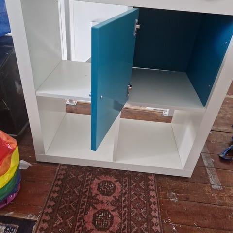 White shelf in good condition. 111x32x80 cm. Currently sitting on side but has feet to stand upright.