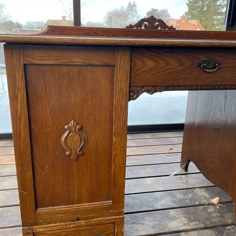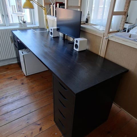 Skrivebordet er i 3 dele- bordpladen og to skuffemoduler. Super nemt at transportere.