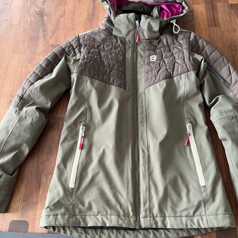 Topkvalitets skijakke til pige, str. 40. grøn. Jakken har hætte og gennemgående lynlås foran. Den er udstyret med flere lynlåslommer udvendigt samt inderlommer. Indersiden har snefang og justerbar talje, som hjælper med at holde sne og vind ude. Ærmerne har justerbare manchetter. Egnet som yderlag til skiløb og andre udendørs vinteraktiviteter. Brugt på 1 uges ferie. Som ny.