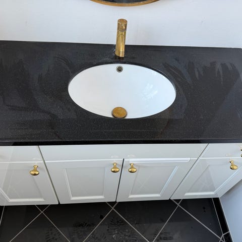 Badeværelsesmøbel med tilhørende Vola armatur og bundventil i messing.