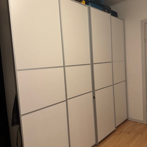 2 skabe (60cm brede med hylder), 1 skab (60 cm bredt med 3 trådkurve), 2 udtræksskuffer (60 cm brede) og 1 skab (40 cm bredt med hylder)sælges for 650 kr. Kommer fra dyre- og røgfrit hjem.