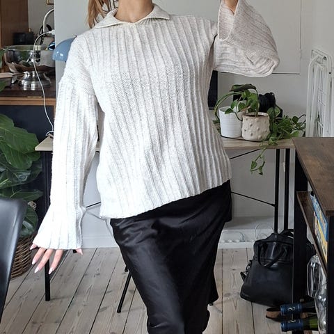 Sort trøje med høj hals og hvide streger Stoffet er blødt og rillet i det