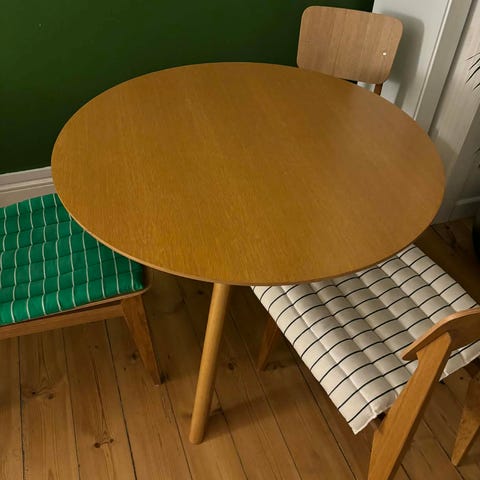 Sælger mit smukke CPH20 spisebord i off white linoleum top og med sæbebehandlet eg ben. Det måler Ø120 x H74.