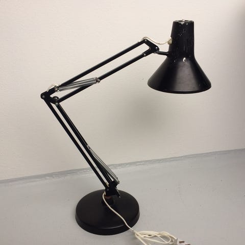 Arkitektlampe Luxo, L-2, i retro brun med beslag til vægmontage fra 1970erne. Original ledning afbryder på skærmen og porcelænsfatning. Alt virker. Armen måler cirka 40 + 32 cm og skærmen er Ø19 cm.