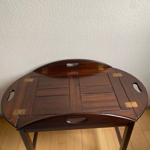 Butler’s tray eller bakketops i mahogni. Pæn stand men med lille skade ved det ene hængsel.