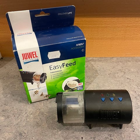 Hydor automatisk foderautomat til akvarium i sort plast. Enheden har digitalt display med knapperne Start og Set samt symboler for fodringsintervaller over 24 timer. Foderautomaten har justerbar åbning til dosering af tørfoder og er egnet til brug på akvarier, hvor fiskene skal fodres automatisk efter indstillet tidsplan. Til batterier.