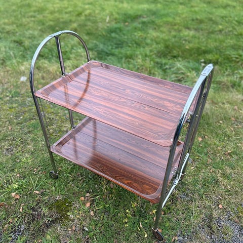 Smukt og velholdt serveringsbord i varmt teaktræ med praktiske hjul og hylder. Perfekt som barbord, kaffebord eller til opbevaring i stue/spisestue.