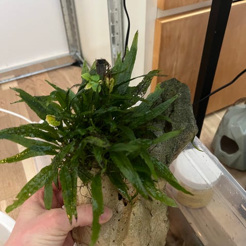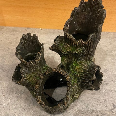 Dekorationsrod monteret på en flad skifersten. Egnet som naturligt skjul og udsmykning i akvarium eller terrarie. Træet er fastgjort til stenen og kan placeres direkte i indretningen. Formen giver flere vinkler og overflader, som dyr kan gemme sig ved eller klatre på. Velegnet til brug sammen med andre naturmaterialer som sten og planter. 12 cm høj