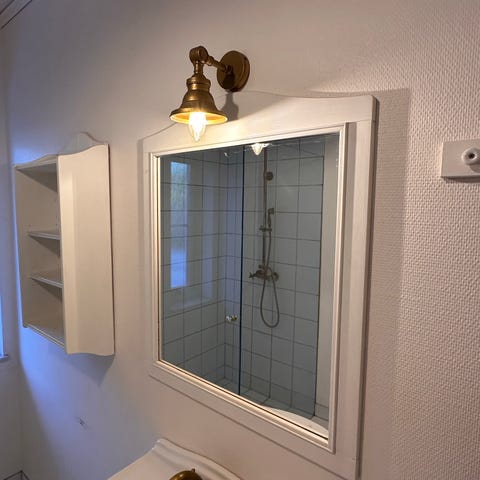 Retro badeværelses tilbehør anno 1968. Hvid håndvask, hvid hylde, spejl, loftslampe, 2 væglamper, håndklæde holder m 3 arme.