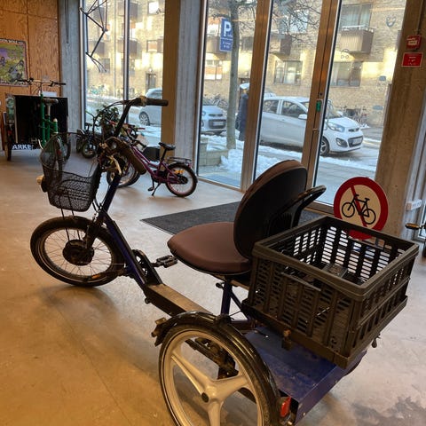 Gammel model af trehjulet cykel fra Cycles Maximus.