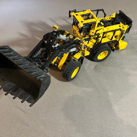 Sættet består af en detaljeret model af en Volvo hjullæsser med bevægelig skovl, store terrændæk og forskellige tekniske funktioner.