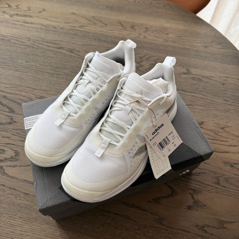 Skoene er i den nye, stilrene farve hvid med navy blue detaljer (2026 model som udkom for en måned siden) – et super fedt og sporty look på banen. De er aldrig brugt og fremstår selvfølgelig helt som nye.