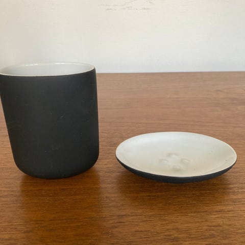 Beholder til evt tandbørst og tandpasta, kam og børste osv, farverne Hvid, Sort og Blå Keramik
