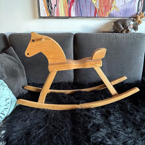 Charmerende ælder Kay Bojesen gynge hest den sælges kun forde der er desværre ikke plads til den mere farverne på den har altid været der. Der ikke gjort noget ved den har altid set såden ud malingen skaller af nogen steder den har kun stået til pynt hos mig men den er en ælder model halsen på den sidder lidt løst der hvor den er sat sammen kan nok laves hvis man er dygtig til at lave sådan nogle ting røg frit og dyre frit hjem