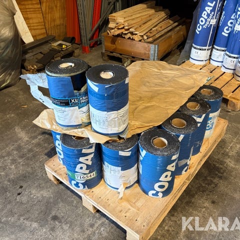 Større parti Icopal Icosafe isoleringsruller bestående af 105 løse indpakkede ruller.