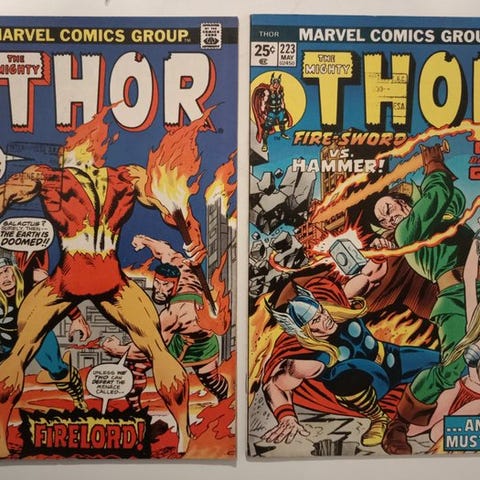 Fem numre af The Mighty Thor fra Marvel Comics Group, Thor-serien, første udgave, hæftet binding, kunstner John Buscema, udgivet 1972–1974, numrene 205, 211, 218, 219 og 221, i diskret tilstand, sprog Engelsk. Klik på den blå "gå til varen" knap, for at købe eller byde på denne vare. Den samlede pris vil blive vist inden du afgiver dit bud.