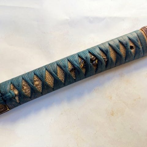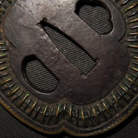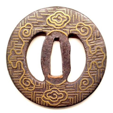 Oprindelse Japan, Edo-perioden, tsuba af messing med hyenjyo blad arabesque indlægsmotiv, stor sukaashi-design, NTK-certifikat og æske; samlede mål 85 × 85 × 4 mm, nakago 30 × 8 mm, vægt 143 g (202 g med æske). Klik på den blå "gå til varen" knap, for at købe eller byde på denne vare. Den samlede pris vil blive vist inden du afgiver dit bud.