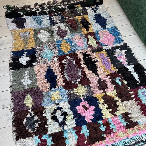 Dette tæppe har markante geometriske motiver og en rig, livlig farvepalet, karakteristisk for vintage Boucherouite-håndværk. Oprindeligt skabt af genbrugstekstiler afspejler det kreativiteten og den kulturelle arv hos marokkanske håndværkere, samtidig med at det giver en stærk dekorativ tilstedeværelse i moderne indretning.