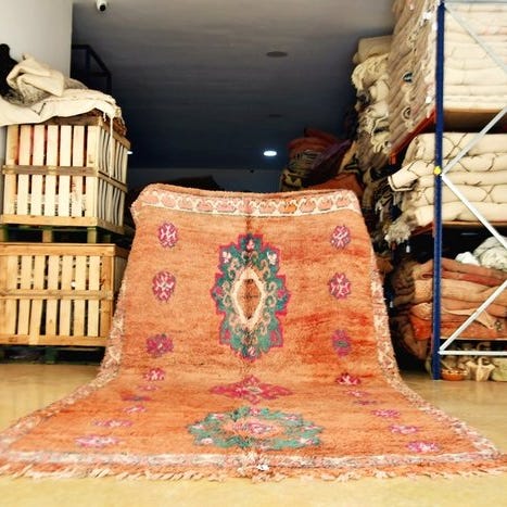 Sjælden vintage Boujad-tæppe fra Marokko, håndvævet af 100 % naturuld i Marokko, måler 200 × 350 cm, orange, i meget god stand til sin alder og professionelt renset. Klik på den blå "gå til varen" knap, for at købe eller byde på denne vare. Den samlede pris vil blive vist inden du afgiver dit bud.