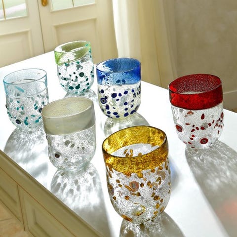 Elegant, raffineret, holdbart ... Smukke Murano-glasbordglas i krystal med pletter fra det prestigefyldte Effetre Murano. Designet af Mar'yana Iskra, en ung designer med en kunstgrad fra Skt. Petersborg og en passion for Murano-glas, hvor hun samarbejder med mange mestre. Disse glas er frugten af Mar'yanas kærlighed til Murano-glas og
