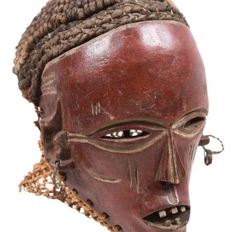 Disse masker inkarnerer normalt forfædre, ånder eller magtfigurer, og spiller en central rolle ved indvielsesceremonier, begravelser eller overgangsritualer. Deres overflade poleres omhyggeligt og dækkes af en glat patina, nogle gange farvet af naturlige pigmenter som kaolin eller okker, for at styrke deres sakrale dimension.