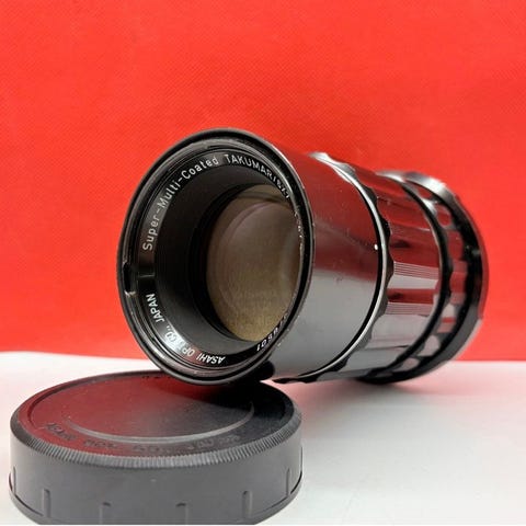 En klassisk Asahi Pentax 6×7-mellemformatkamera parret med det højt anerkendte Super-Multi-Coated Takumar 300mm f/4 telefotoobjektiv.