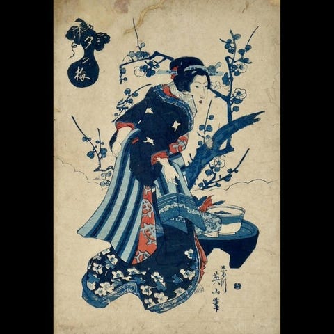 Shakudo ume blomstergren, sommerfugl-motiv Nakakoji shakudo fuchi kashira-sæt med æske