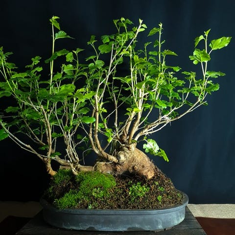 Hans grove bark, elegante buede grene og store, håndformede blade giver ham et levende, næsten legende udtryk. Om sommeren kan han endda bære små, søde frugter – en sjælden godbid i bonsaiform.